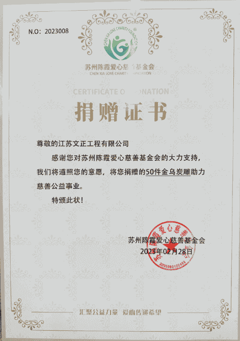 “党建共建 发挥合力 传递爱心”2月28日,我公司党支部书记朱丽文一行代表公司向苏州陈霞爱心慈善基金会党支部捐赠具有环保功能的金乌炭雕50件,助力慈善公益事业。