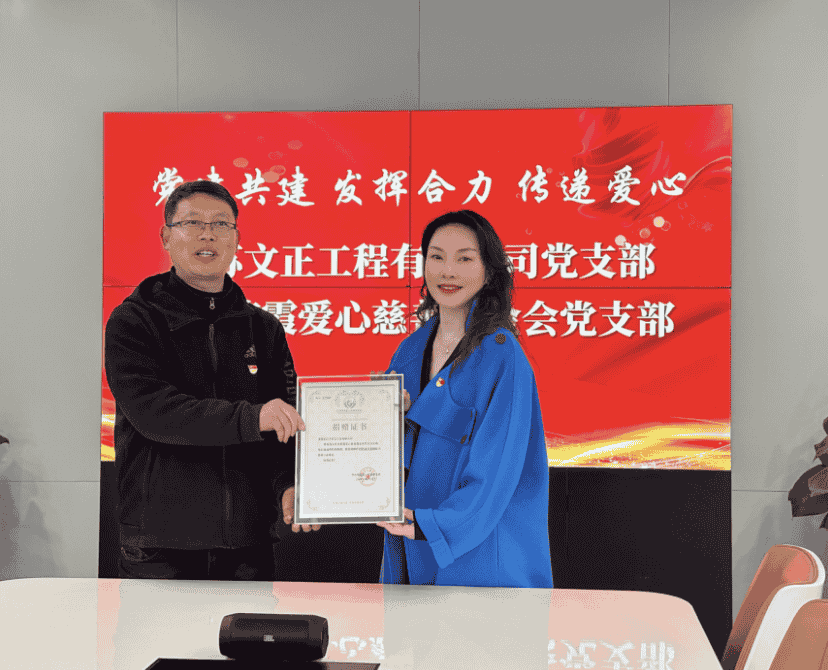 活动中,朱书记向陈霞爱心慈善基金会捐赠金乌炭雕,基金会党支部副书记高洪宇为我公司颁发捐赠证书。