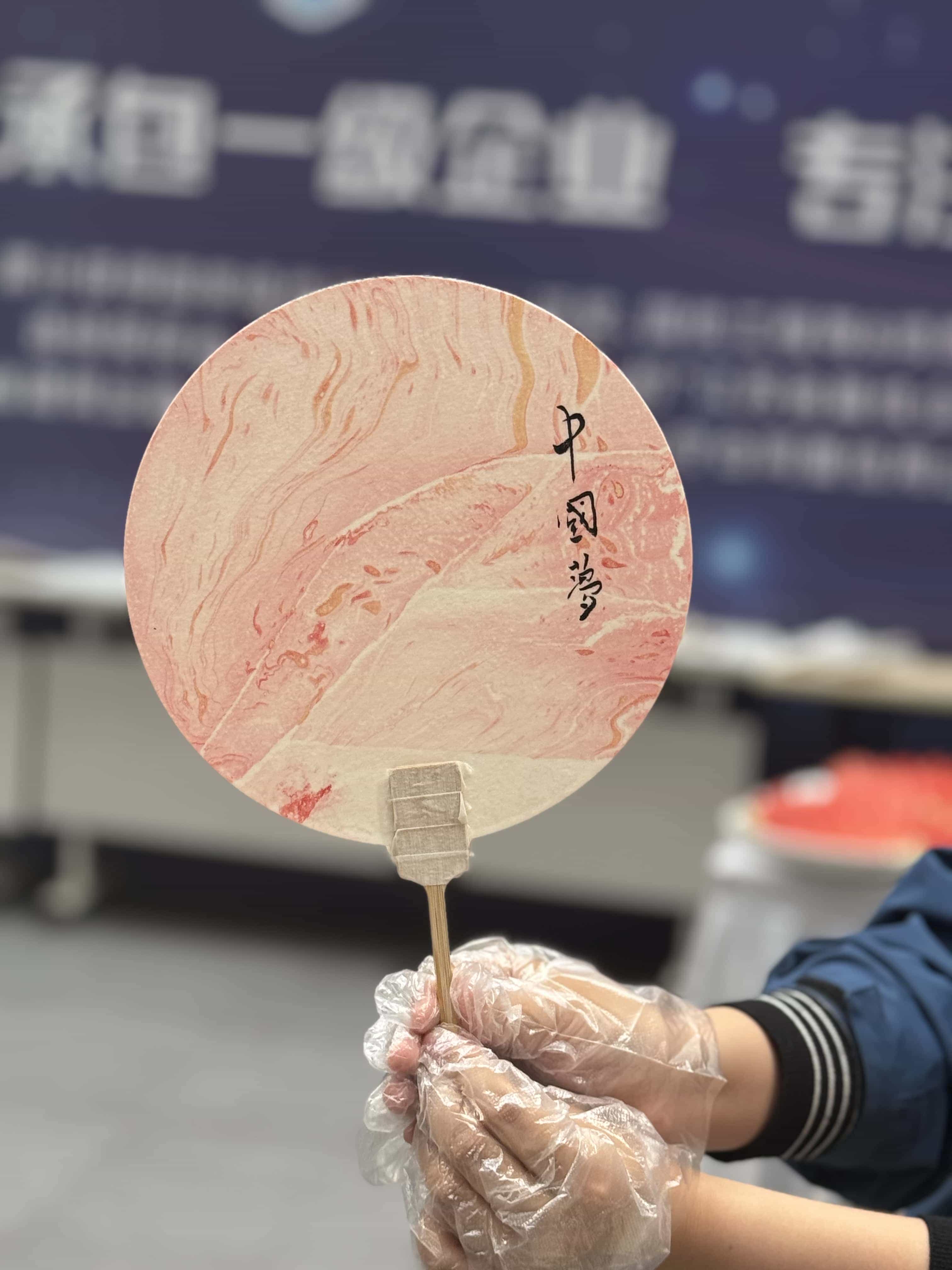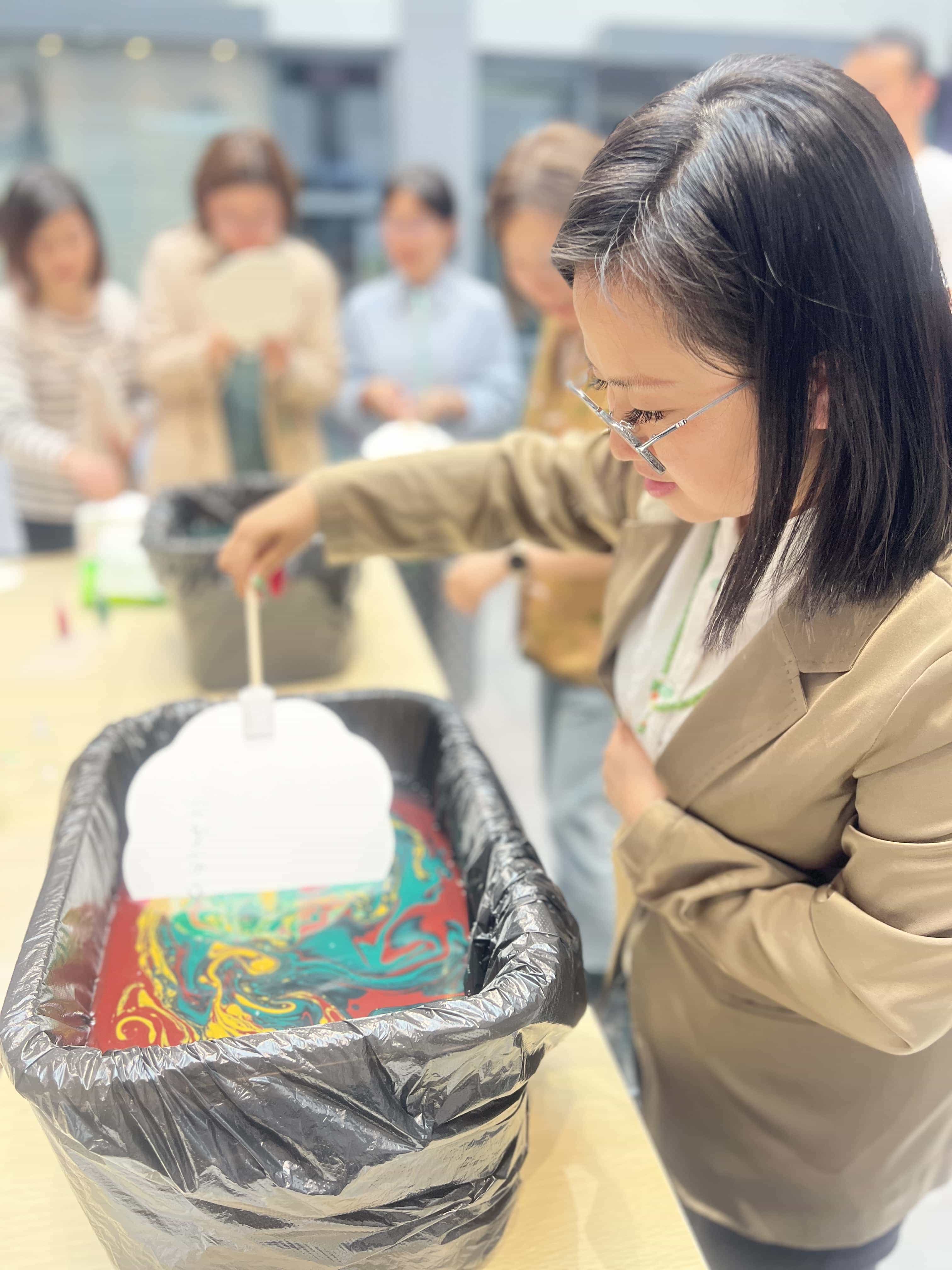 听完漆扇的介绍,大家跃跃欲试,纷纷开始了漆扇的创作。选好自己喜欢的颜色后,滴入水中,轻微搅拌出纹理后,迅速将白色扇面放入水中。抖动、旋转,不同的方式、不同的配色,所有的图案都不一样,绚丽多彩,每一把漆扇都有自己独特的美。