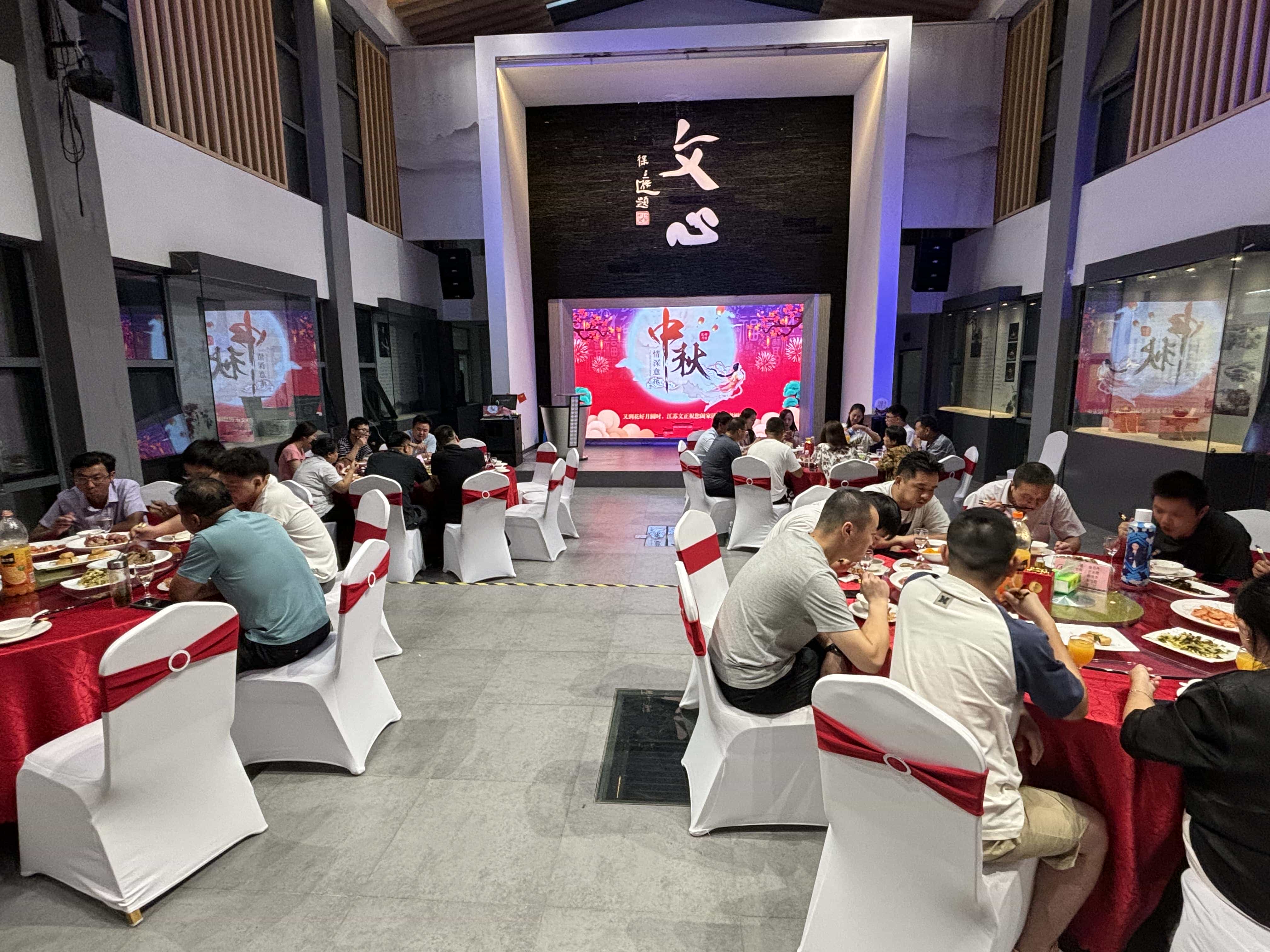 随着夜幕的缓缓降临,明月渐渐爬上枝头,我司精心准备的中秋晚宴也在温馨的氛围中开始了。餐厅里灯火通明,一张张餐桌上摆满了丰盛的佳肴,散发着诱人的香气。来宾们围坐在一起,脸上洋溢着幸福的笑容。大家在这个特殊的时刻放下了工作的疲惫,尽情享受着美食带来的味蕾盛宴。