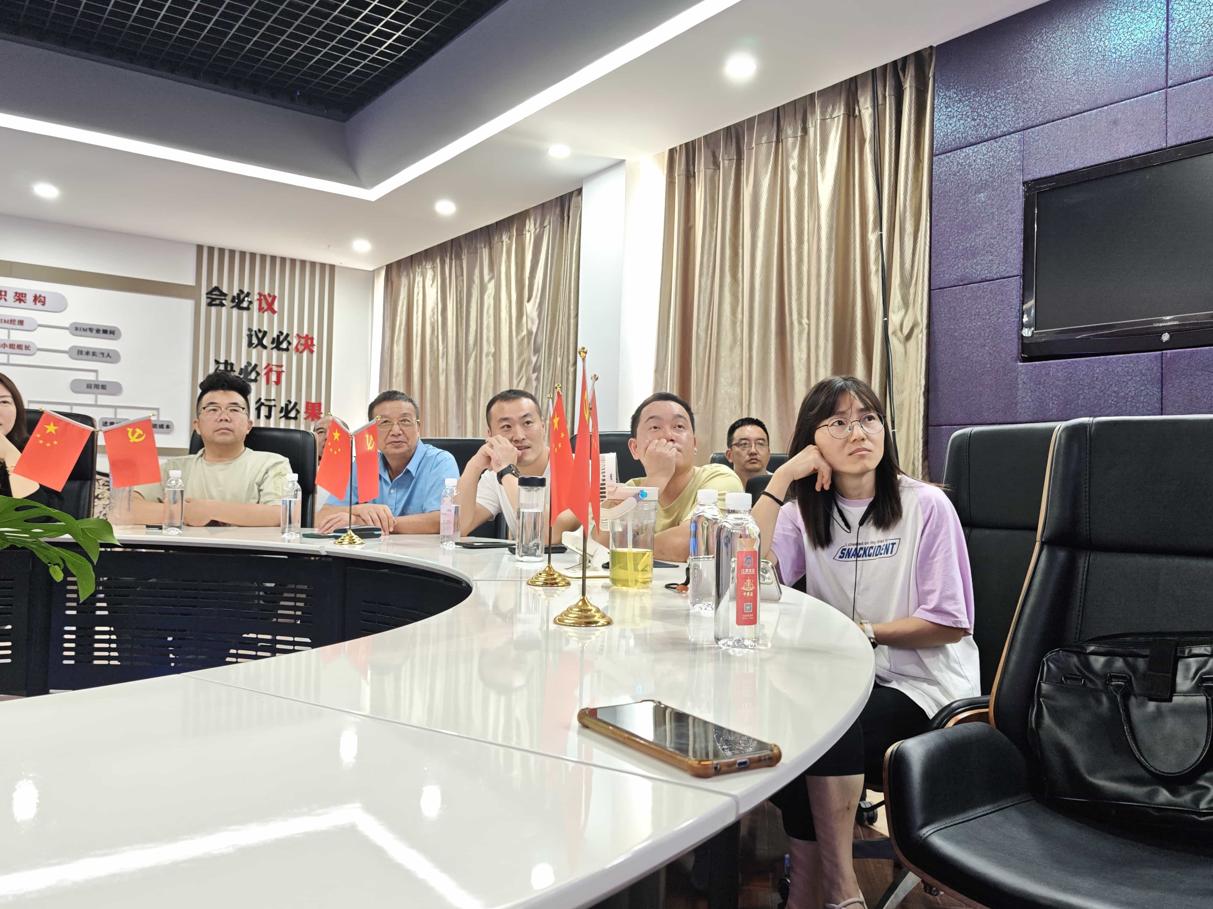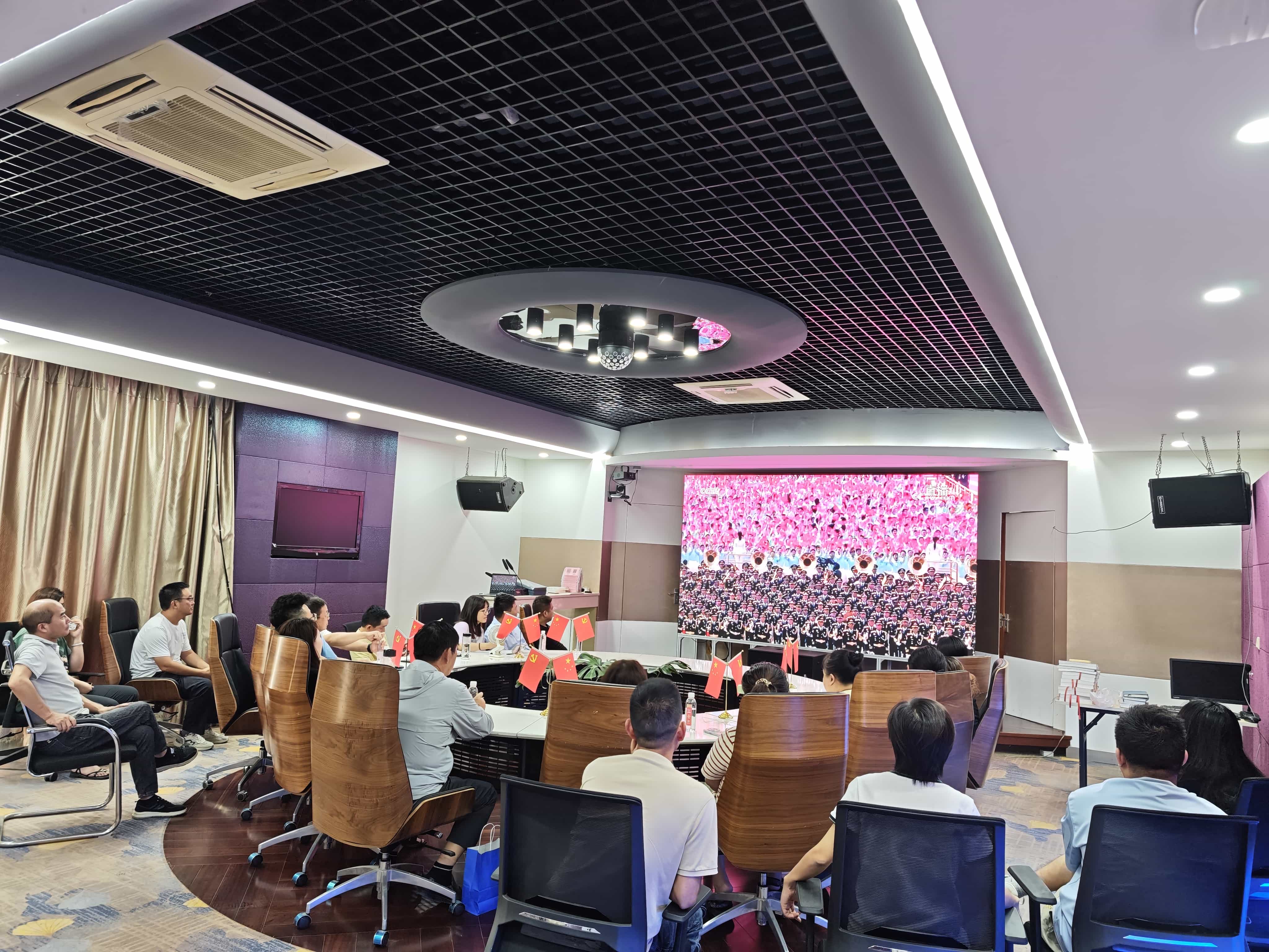 公司会议室内,大家整齐就坐,怀着无比激动和自豪的心情收看阅兵盛况。当雄壮的国歌声响起,全体人员自发起立,共同高唱国歌,表达对祖国的热爱与敬意。